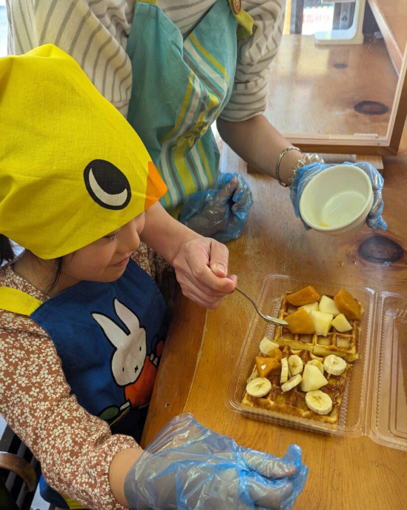 好きなフルーツやクリームを乗せたり食べたり、親子で楽しくご参加ください。